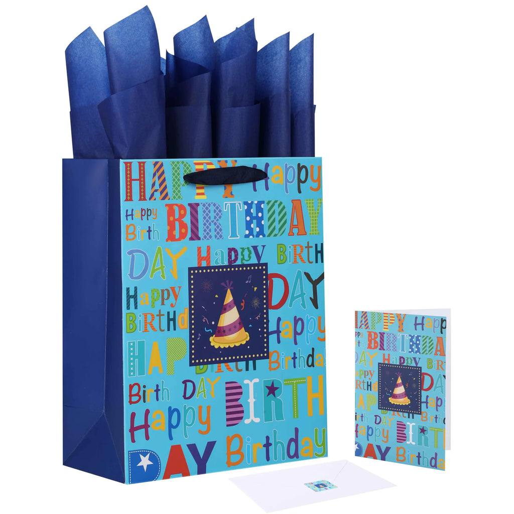 13" Large Blue Gift Bag Set with Greeting Card & Tissue Paper