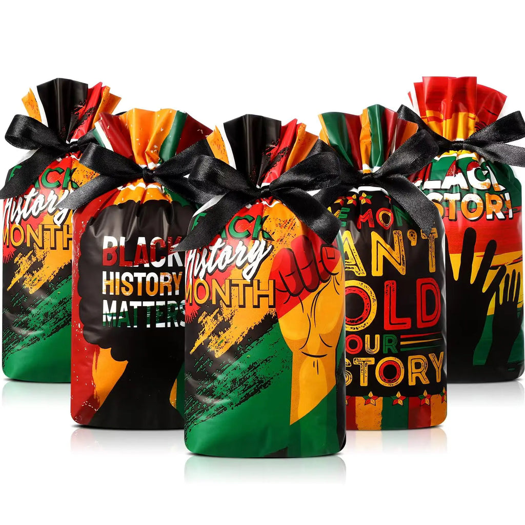 Celebrate Black History: Our 48-piece set of Black History Month Bags prominently features inspirational slogans like 'Black History Month' and 'Black History Matters', along with empowering symbolism including a raised fist and an African woman silhouette, perfectly capturing the essence of Black History Month.