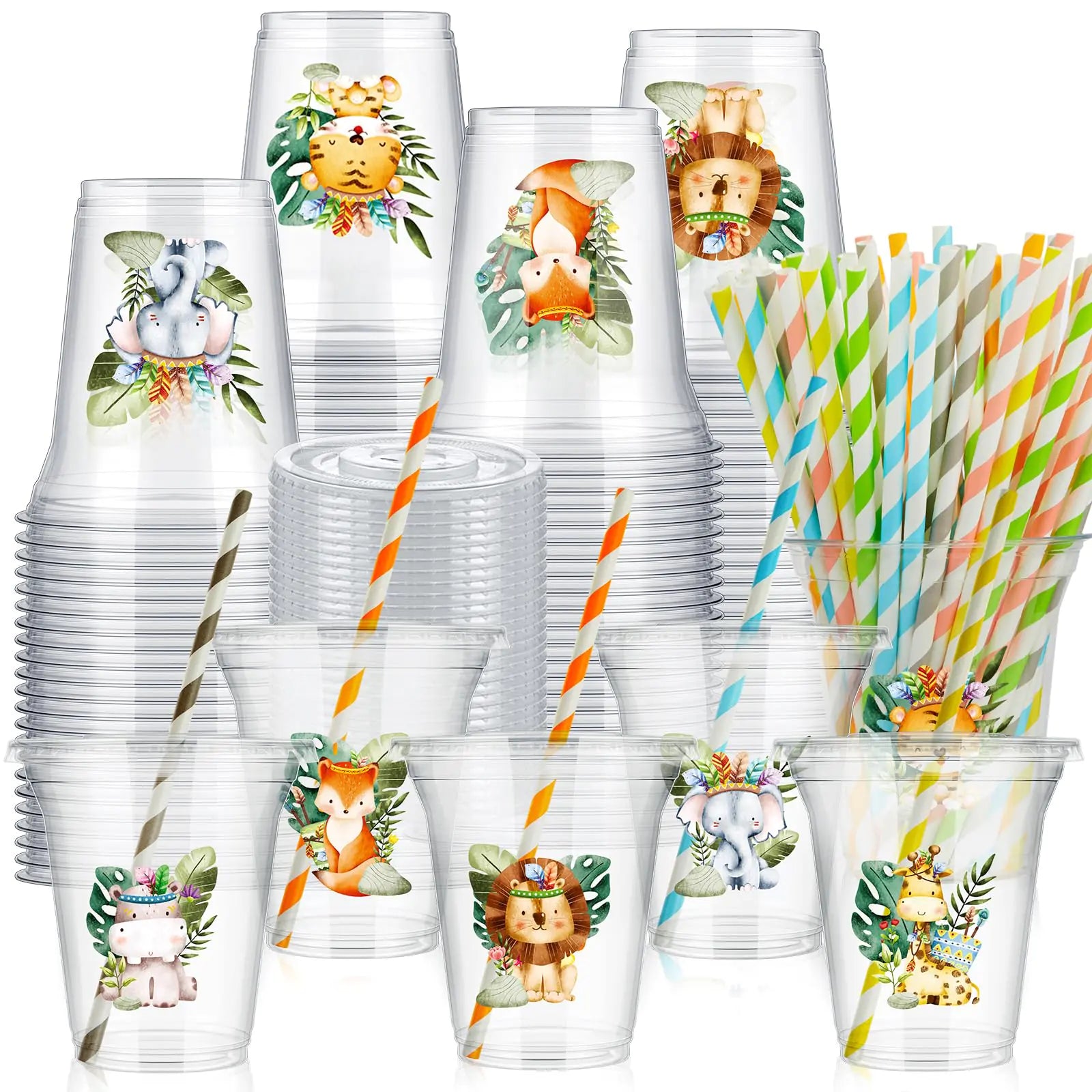 • Complete Party Set: Includes 36 plastic cups with lids and jungle-themed stickers plus 36 colorful striped paper straws, perfect for themed celebrations or daily use.