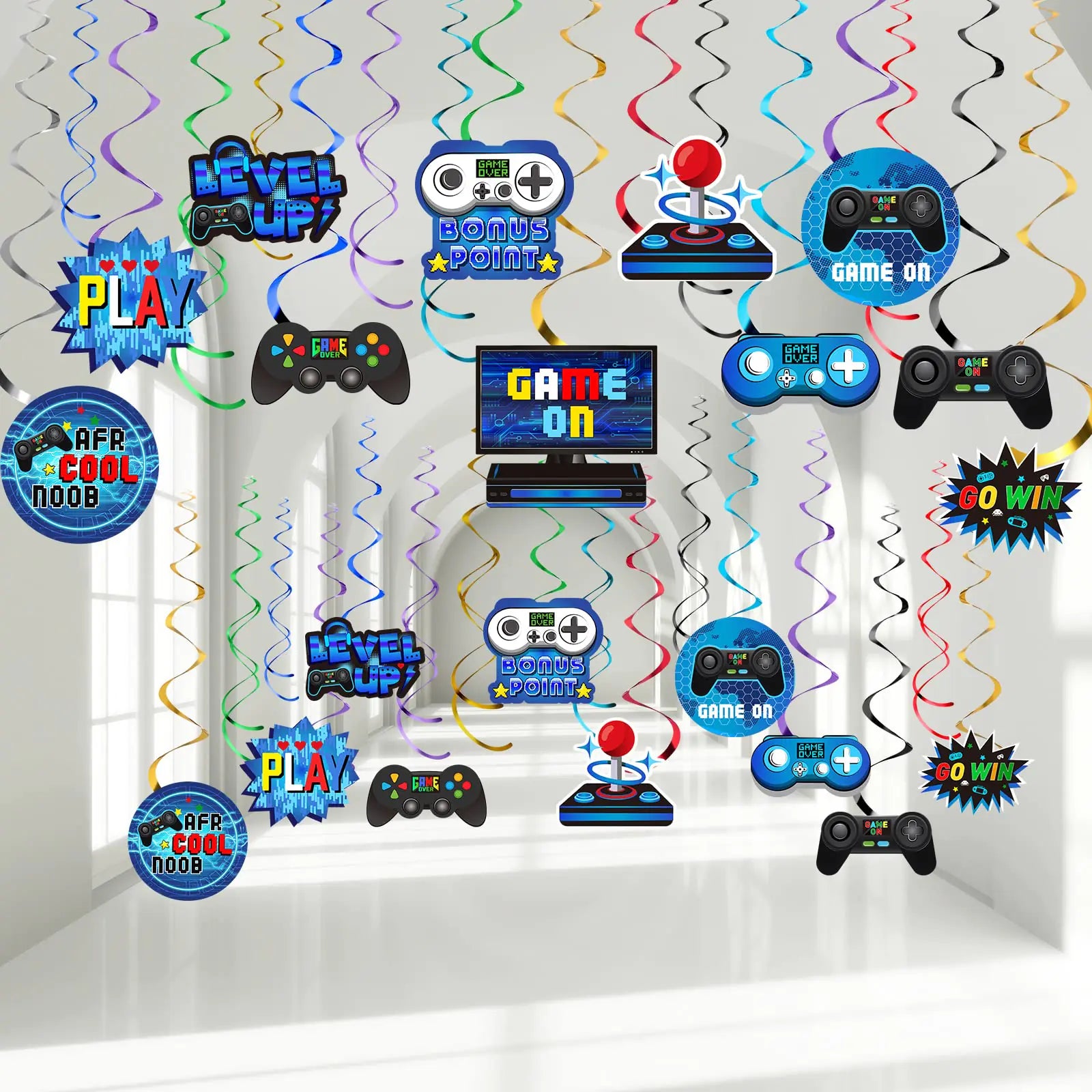 • 21 × Foil Swirl Decorations with Video Game Cutout Cards (11 unique styles)