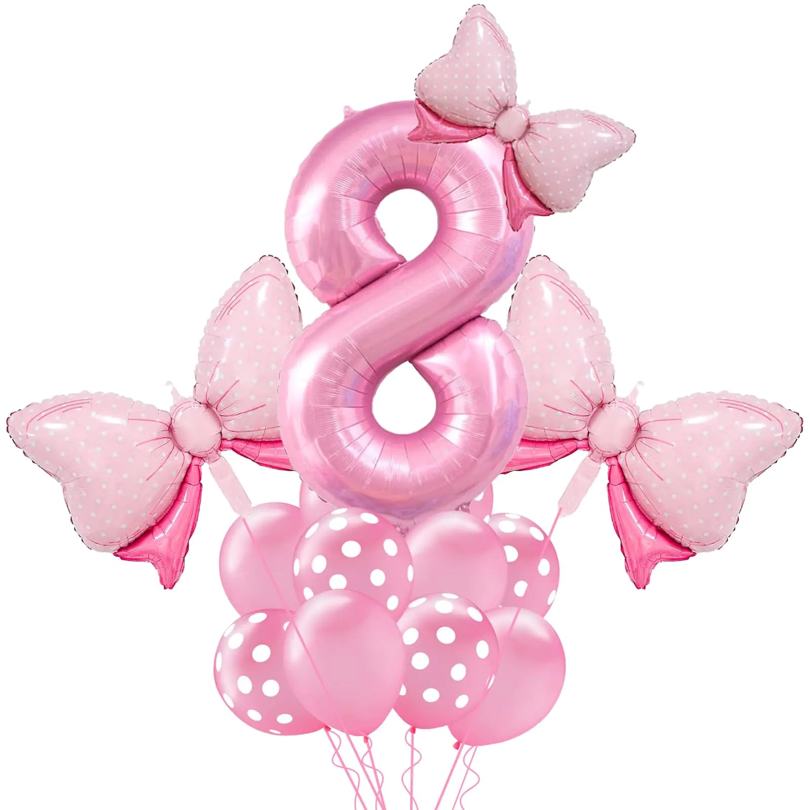 Celebrate in style with this Pink Number 8 Balloon Decoration Kit — perfect for birthdays, anniversaries, or any special occasion! This vibrant set includes one 40-inch pink number 8 balloon with a bow, two bow-shaped balloons, and ten pink latex balloons, giving you everything you need to create a stunning party display.
