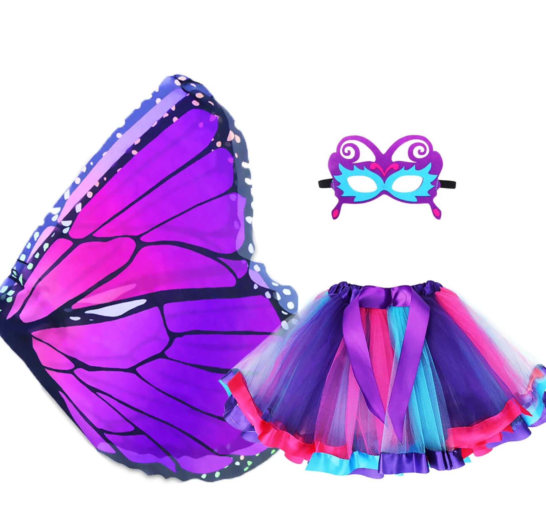 The rainbow tutu skirt (waist: 9.8″, length: 10.66″) fits most girls ages 3–9 years, while the lightweight chiffon butterfly wings (wingspan length: 25.5″, width: 47.2″) let them flutter and twirl with ease. The set is completed with a charming felt butterfly mask, adding the perfect finishing touch.