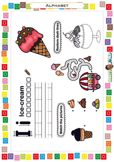 Letter I Alphabet Worksheet – Ice Cream Theme with Tracing, Matching & Dash Lines