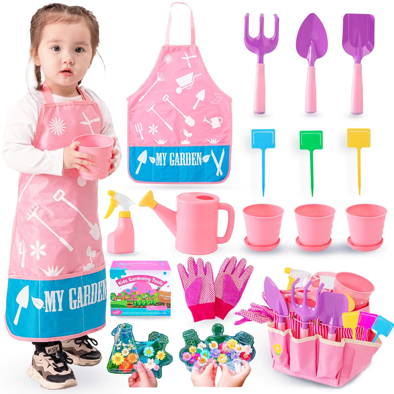 Everything your little gardener needs is right here! This adorable pink gardening kit includes a rake, fork, trowel, watering can, gloves, apron, tote bag, plant pots, and fun DIY bookmark kits—perfect for sparking a love of nature and creativity.