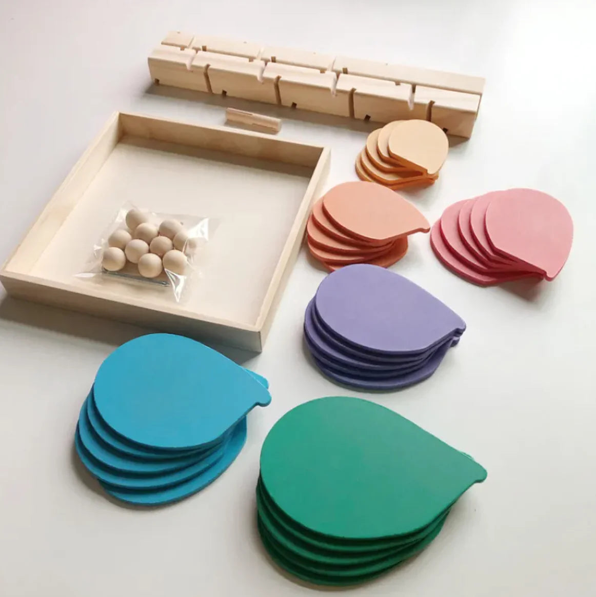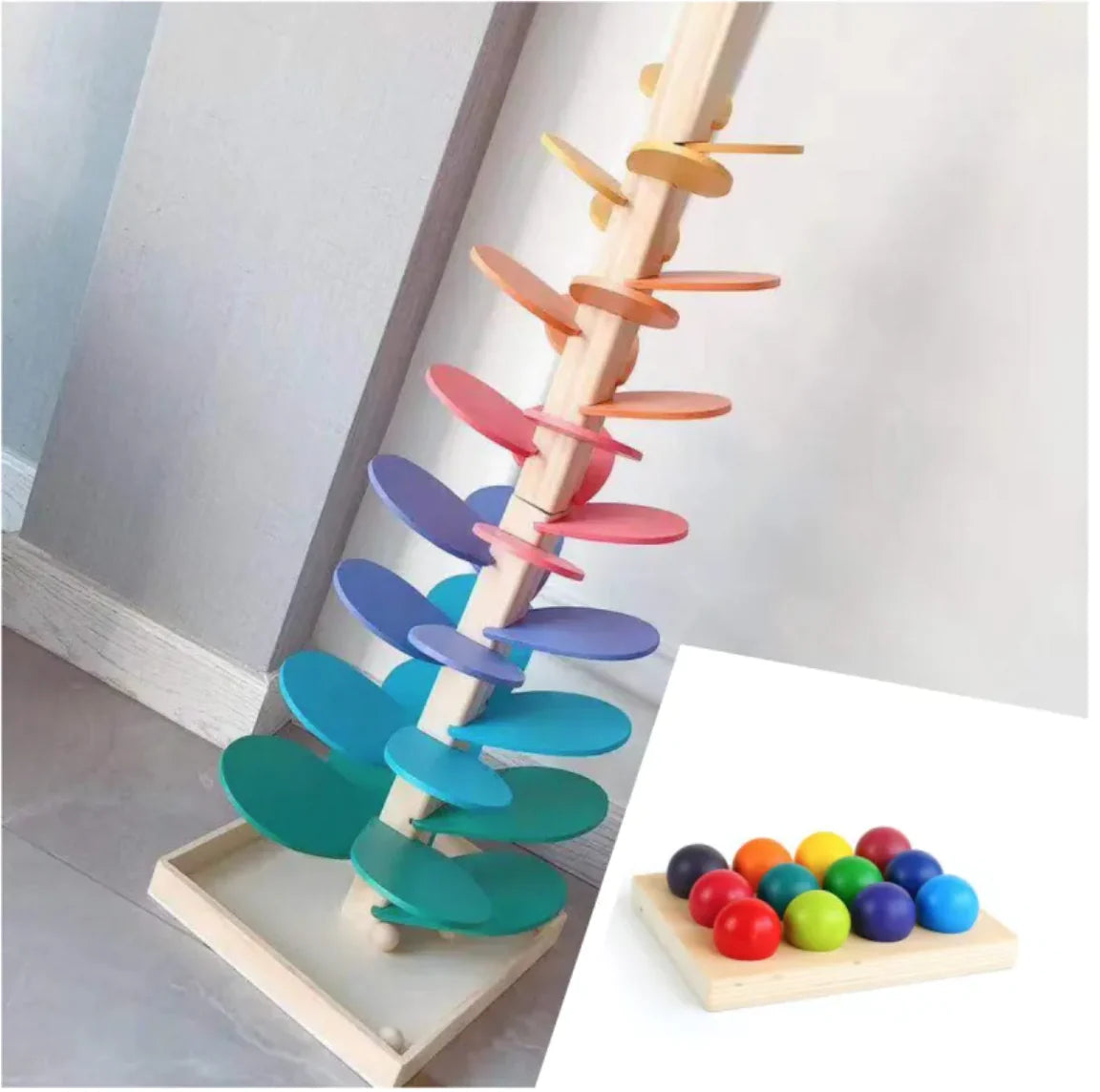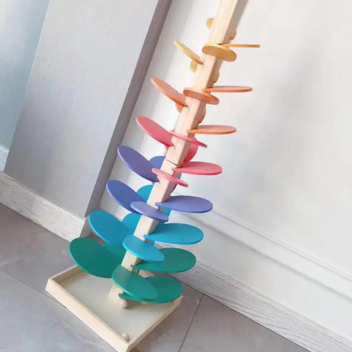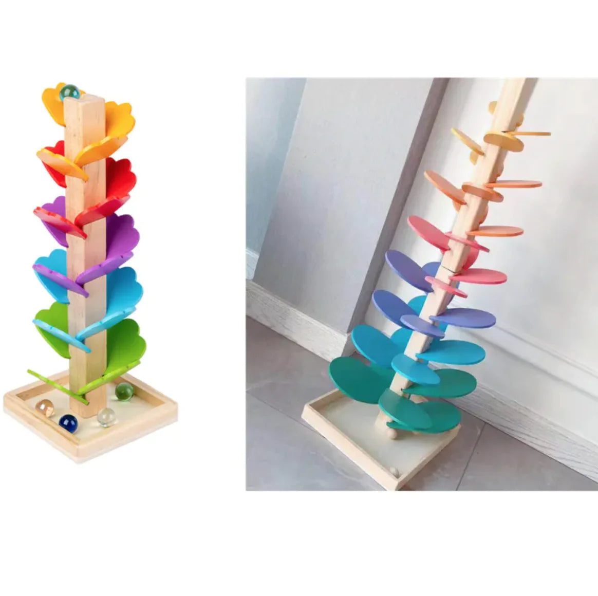 Marble Maze, designed for early education, features a leaf tower structure with rolling marbles, encouraging sensory development and hand-eye coordination, colorful and interactive design to engage children, helps improve motor skills and problem-solving abilities, made from child-safe, non-toxic materials, lightweight and easy to assemble, perfect for home, daycare, or preschool environments, provides hours of fun and learning, ideal gift for toddlers and young children.